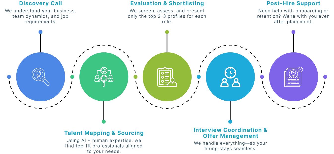 Our Direct Staffing model connects you with permanent, high-performing professionals who are aligned with your business goals, values, and vision. Whether you're scaling across USA, EMEA Regions, APAC, Middle East & India, we ensure that the right talent meets the right opportunity—every time.